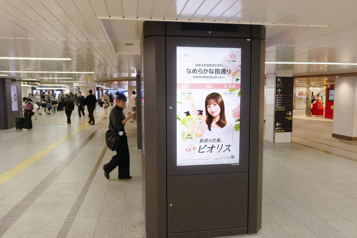「〝あたらしいビオリス″と〝ビオリスならではの橋本環奈さん″の魅力を訴求するという点では、クライアントさんと時間をかけてつくりあげたキービジュアルに集約されるのですが、OOHという、生活者が通り過ぎるメディアという点も踏まえて、立ち止まって注目していただけるクリエイティブのフックを掲出場所に合わせて企画しました。OOHは不特定多数のかたにも見ていただけるメディアですので、多くの層のかたにアプローチすることで話題化できることも目指しました」