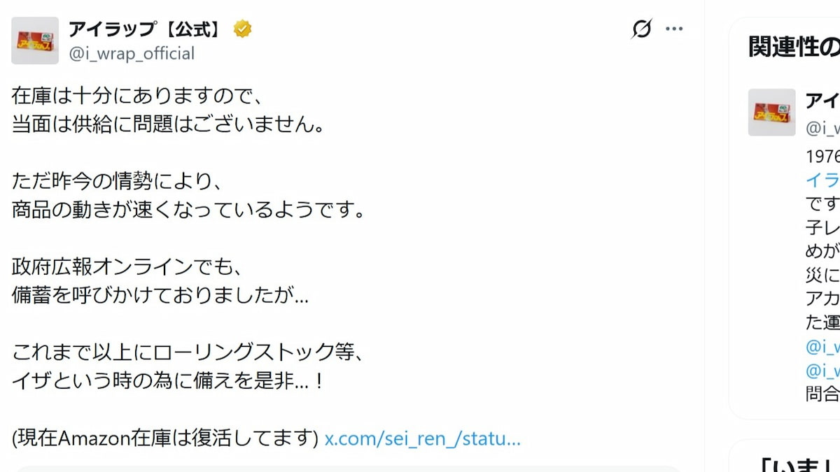 アイラップを展開する岩谷マテリアルは4月7日、Xで「在庫は十分にありますので、当面は供給に問題はございません」と投稿した。投稿では、昨今の情勢を受けて商品の動きが速くなっているとの認識を示すとともに、政府広報オンラインによる備蓄の呼びかけにも触れ、ローリングストックなどを通じた日頃からの備えを呼びかけた。