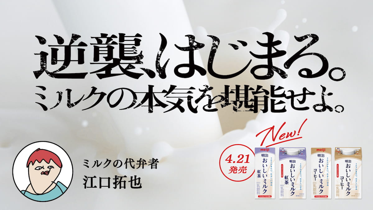 明治の「明治おいしいミルクシリーズ」は4月7日、声優・江口拓也を起用し、ミルクがラテの主役をコーヒー・紅茶から奪い取りに行くプロモーション「#逆襲はじまるミルクの本気を堪能せよ」を開始。「明治おいしいミルクコーヒー」200mlの販路拡大、「明治おいしいミルク紅茶」の発売に合わせ、Web動画放映やSNSキャンペーンなどを実施する。