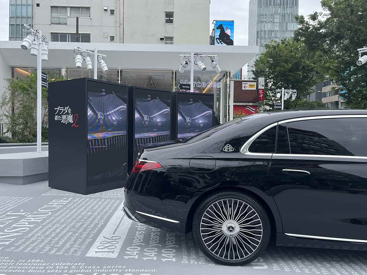 オープンのタイミングでは、映画『プラダを着た悪魔2』に関連した展示も。劇中でミランダ・プリーストリーが使用している車両と同型のモデル「メルセデス・マイバッハ Sクラス」を展示する。