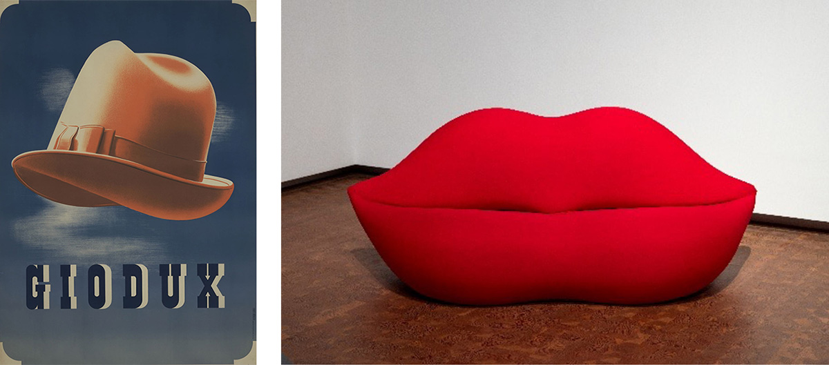 フリッツ・ビューラーのポスター「ジオデュの帽子」(左)、スタジオ65のソファ「ボッカ」 (右)