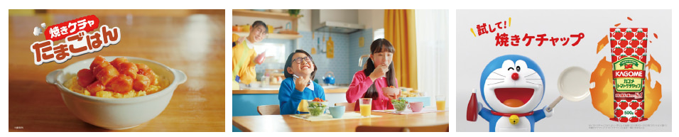 新CM「焼きケチャたまごはん」篇および「焼きケチャたまごパン」篇をWebやテレビで放映するほか、シネアドを展開。店頭では、ドラえもんオリジナルパッケージの「カゴメトマトケチャップ」を数量限定販売するなどしている。キャンペーンのメインターゲットは、ケチャップの使い方が「つける・かける」にとどまっている層だ。