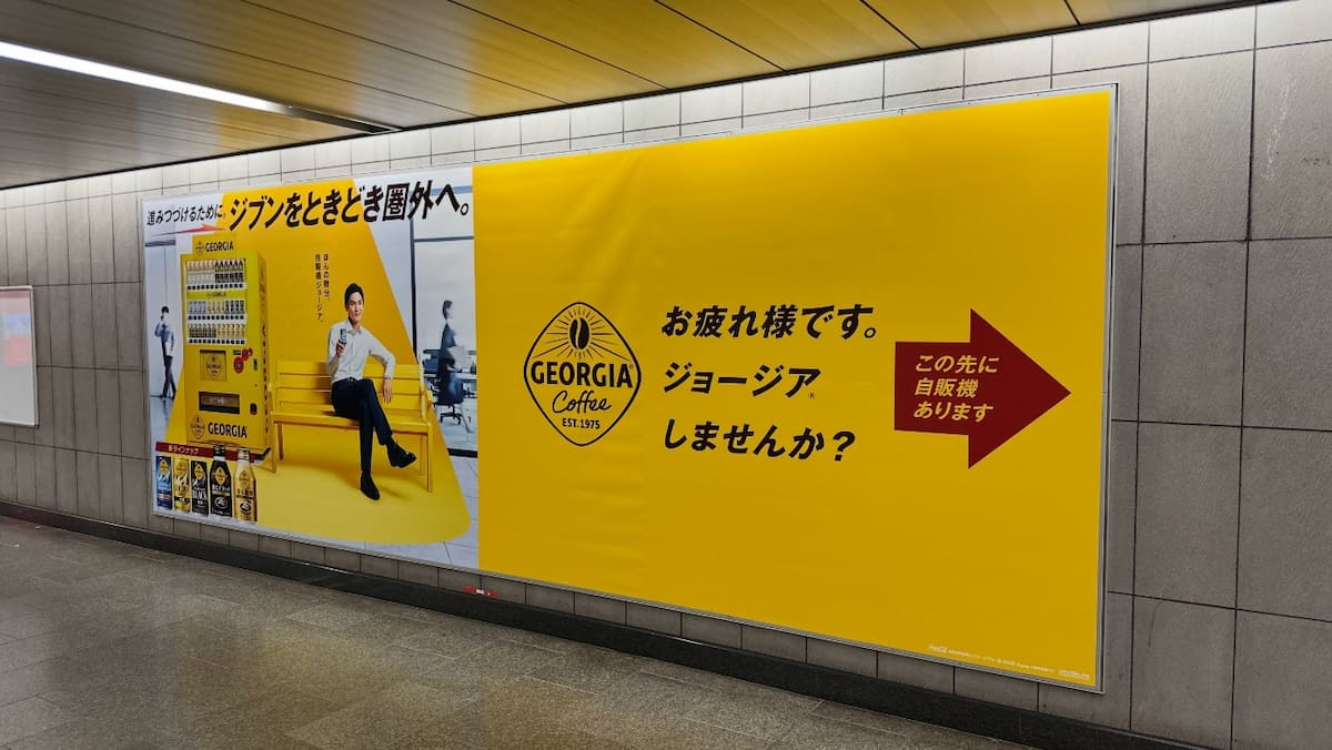 俳優の高良健吾さんを起用したテレビCMでは、高良さんが仕事の合間に、ブランドカラーのイエローでラッピングした自動販売機に向かい、黄色いベンチに座って「ジョージア」を味わうことで、再び次の業務へと一歩踏み出す姿を描いた。