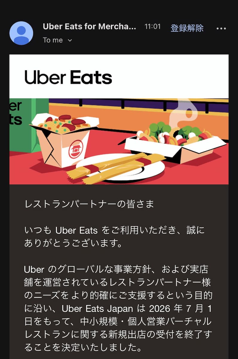 同社はレストランパートナーに向けた文章で、「Uberのグローバルな事業方針、および実店舗を運営されているレストランパートナー様のニーズをより的確に支援するという目的に沿い」との理由を示し、中小規模・個人営業のバーチャルレストランに関する新規出店について、今年7月1日で新規出店の受付を終了することを決定した、と明示した。