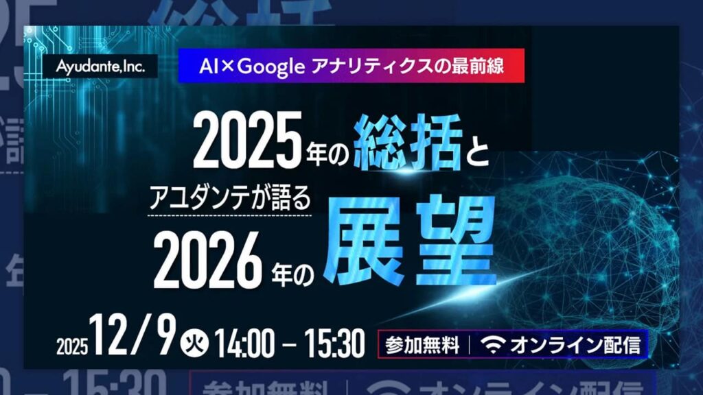 来る12月9日(火)、オンライン配信にて、「AI×Google アナリティクスの最前線~2025年の総括とアユダンテが語る2026年の展望~」と題したセミナーが...