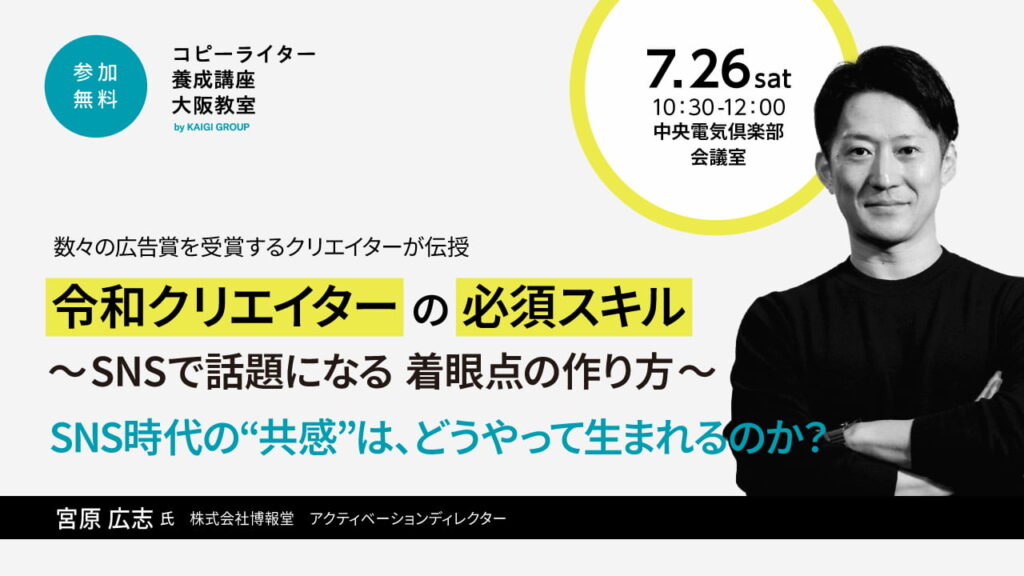 本講座では、大阪広告協会佐治敬三賞を受賞したクリエイターから、SNSやPRを意識したコトバの広がり、表現開発のメソッドや考え方をお伝えいたしま... -