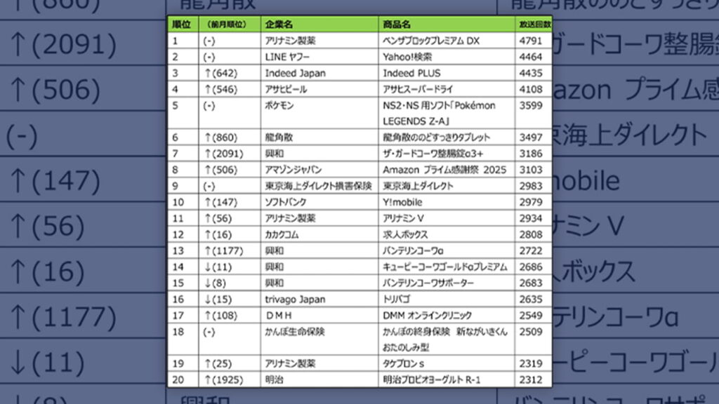 2025年10月テレビCM放送回数ランキング 1位は「ベンザブロック」、SMN調査
