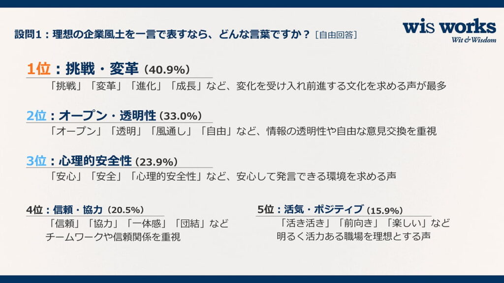 ウィズワークスは11月28日、理想の企業風土や、企業風土づくりにおける課題点重視傾向課題などの企業風土にまつわるアンケート調査結果を発表した... -