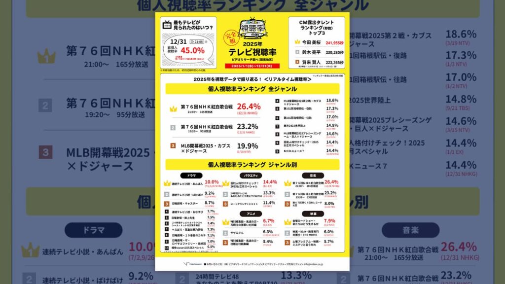 ビデオリサーチは1月22日、「2025年テレビ視聴率総まとめ(完全版)」を公表した。 -