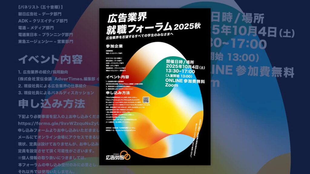 広告業界の労務環境改善などを執り行う広告労協は、10月4日に学生に向けたイベント「広告業界就職フォーラム」を開催する。 -