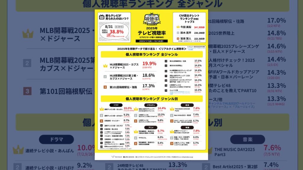 ビデオリサーチは、12月22日の「視聴率の日」を前に、2025年(1月1日〜12月14日)のテレビ視聴率調査結果や見逃し配信の再生回数ランキング、SNSの... -