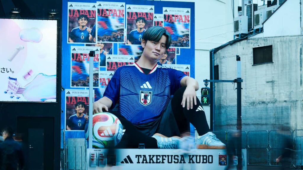 サッカー日本代表2026年ホームユニフォームの発表に合わせ、渋谷の道玄坂広場に突然姿を現した巨大な久保建英選手──通称「ビッグタケ」。 -