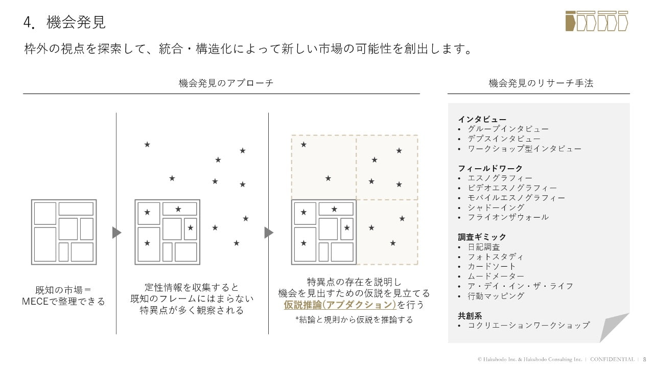 そのために有効なのが、発散と収束を繰り返す「サービスデザイン・プロセス」に基づく、定性情報を収集・統合する機会発見アプローチによる課題の特定と、プロトタイピングを活用した解決策の創造です。