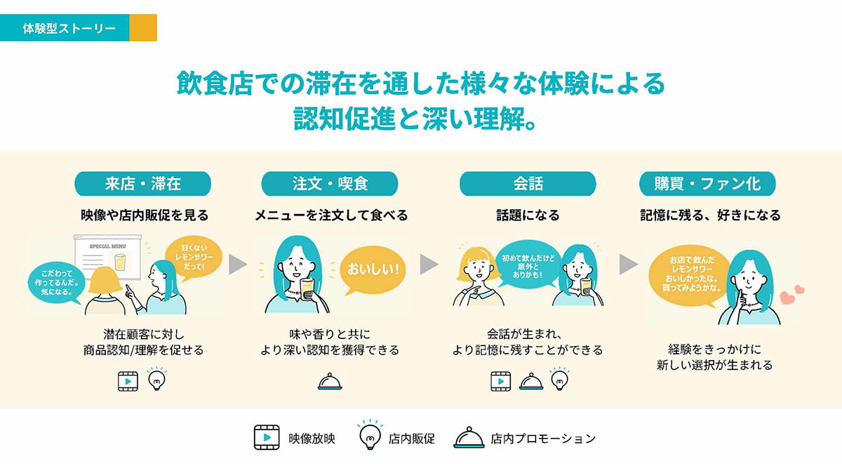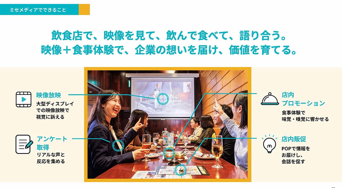 ミセメディアは、飲食店というリアルな空間で、映像視聴と喫食を中心とした様々な体験を組み合わせて行うことができる【体験型のプロモーションサービス】です。